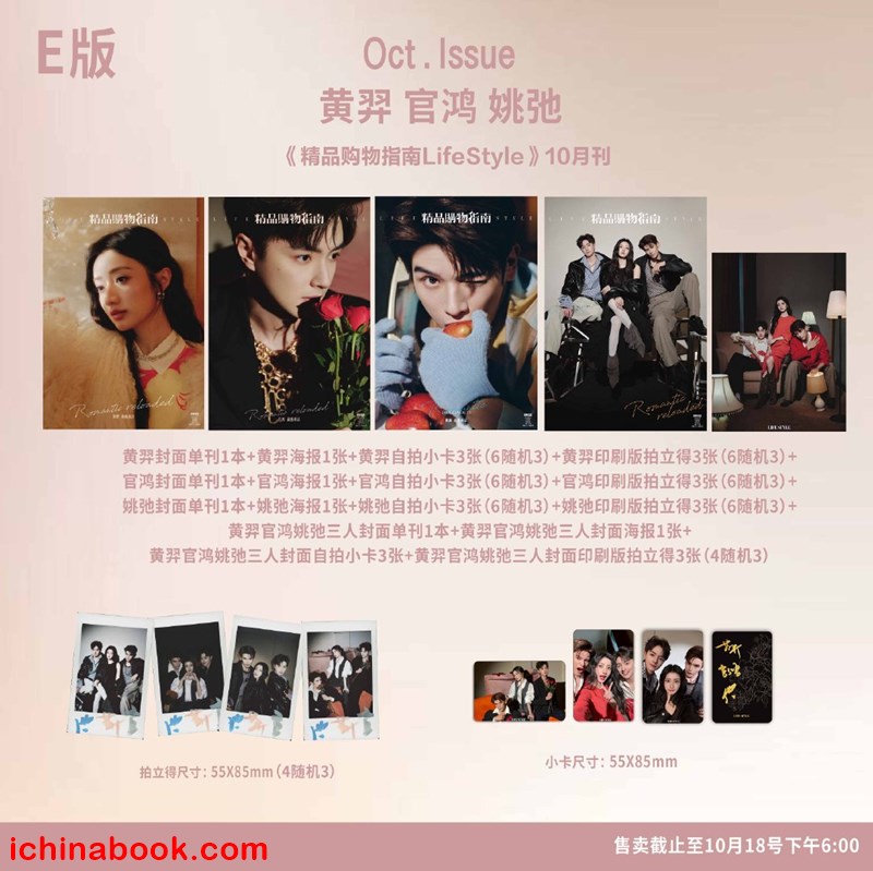 E版套装(黄羿官鸿姚弛三人封面):A版套装1套+B版套装1套+C版套装1套+黄羿官鸿姚弛三人封面单刊1本+黄羿官鸿姚弛三人海报1张+黄羿官鸿姚弛三人自拍小卡3张+黄羿官鸿姚弛三人印刷版拍立得3张(4随3)